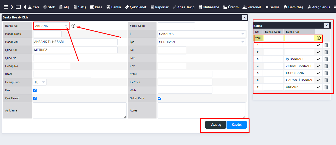Açılan sayfada Banka Adı seçimi yapılır. *Not: Eğer istediğiniz banka yoksa "+" butonu tıklanarak yeni banka adı ekleyebilirsiniz. Tüm banka bilgilerinizi girerek kayıt işlemi yapabilirsiniz.