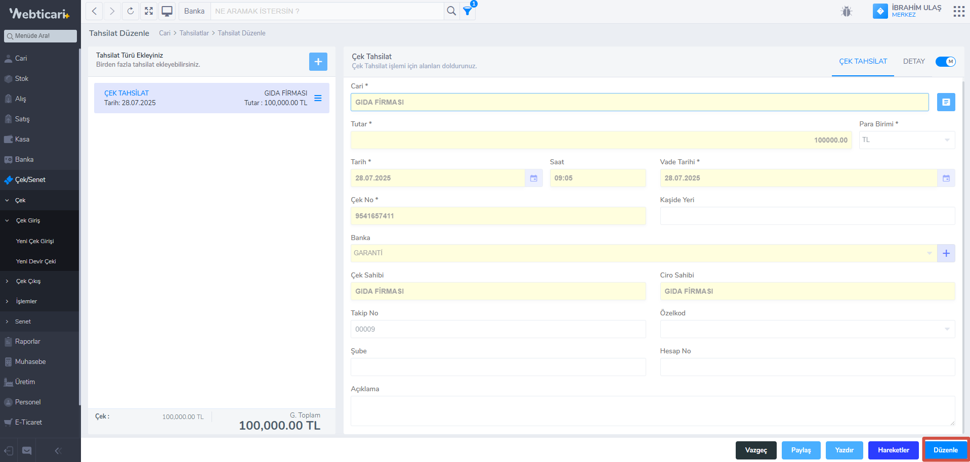 - Ekranınızın sağ altında bulunan Düzenle tuşuna basarak girdiğiniz bilgileri tekrardan düzenleyebilirsiniz. Eğer bilgileri değiştirmek istediğiniz çekin hareketi varsa Hareketler bölümünden çekin hareketlerini silmeniz gerekmektedir.