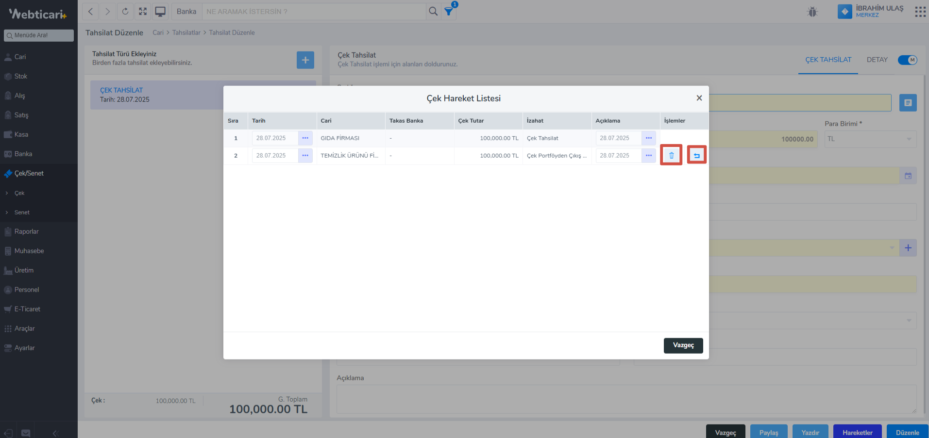 - Açılan pencerede çekinizin hareketlerini görüntüleyebilir, silebilir ve çeki geri alabilirsiniz.
