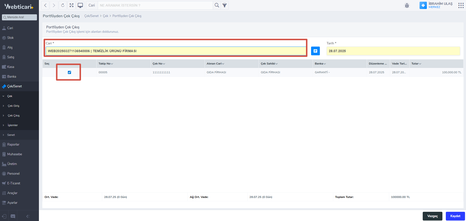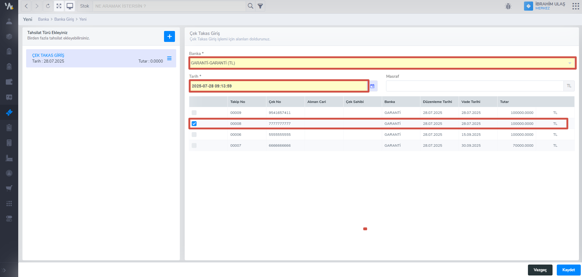 - Çekiniz listelenecektir. Çeki seçip kaydet dediğinizde çek takas işlemi kaydedilecektir.