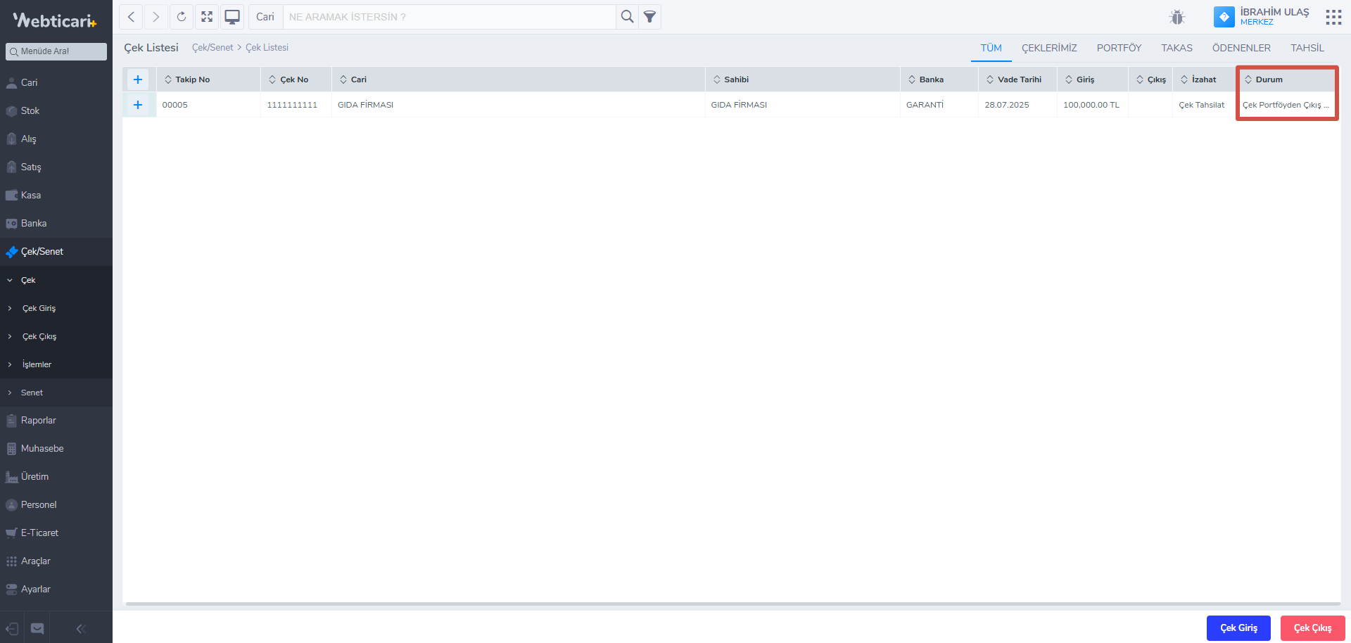 - Böylece çek portföyden çıkılmış olacaktır. Çek listesinden çekin durumunu kontrol edebilirsiniz.