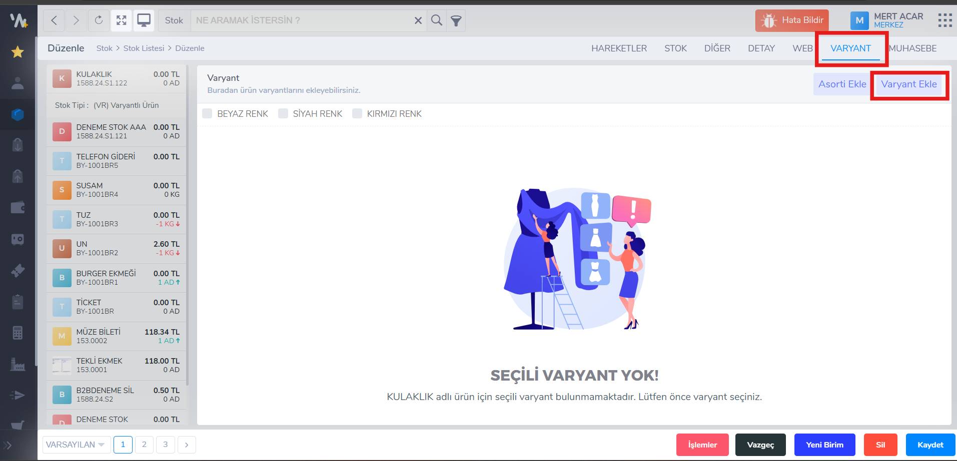1. Stok seçildikten sonra Stok Tipi alanından Varyantlı Ürün (VR) alanını seçip kaydet demelisiniz.Daha sonra üstteki tablardan Varyant -> Varyant ekle butonuna tıklayarak “kod” ve “varyant adı” yazarak varyantlarınızı tanımlayınız.
