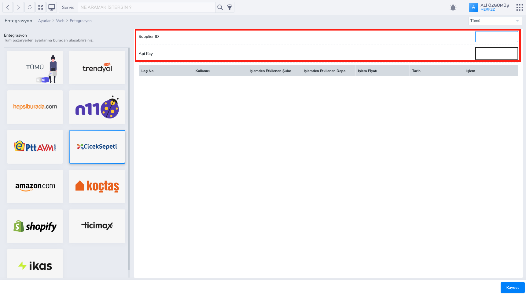 Çiçeksepeti sisteminde satış yapıyor ve webticari ile entegrasyonlu çalışmak istiyorsanız, öncelikle, api bilgilerinizi Webticari sistemine girmelisiniz.