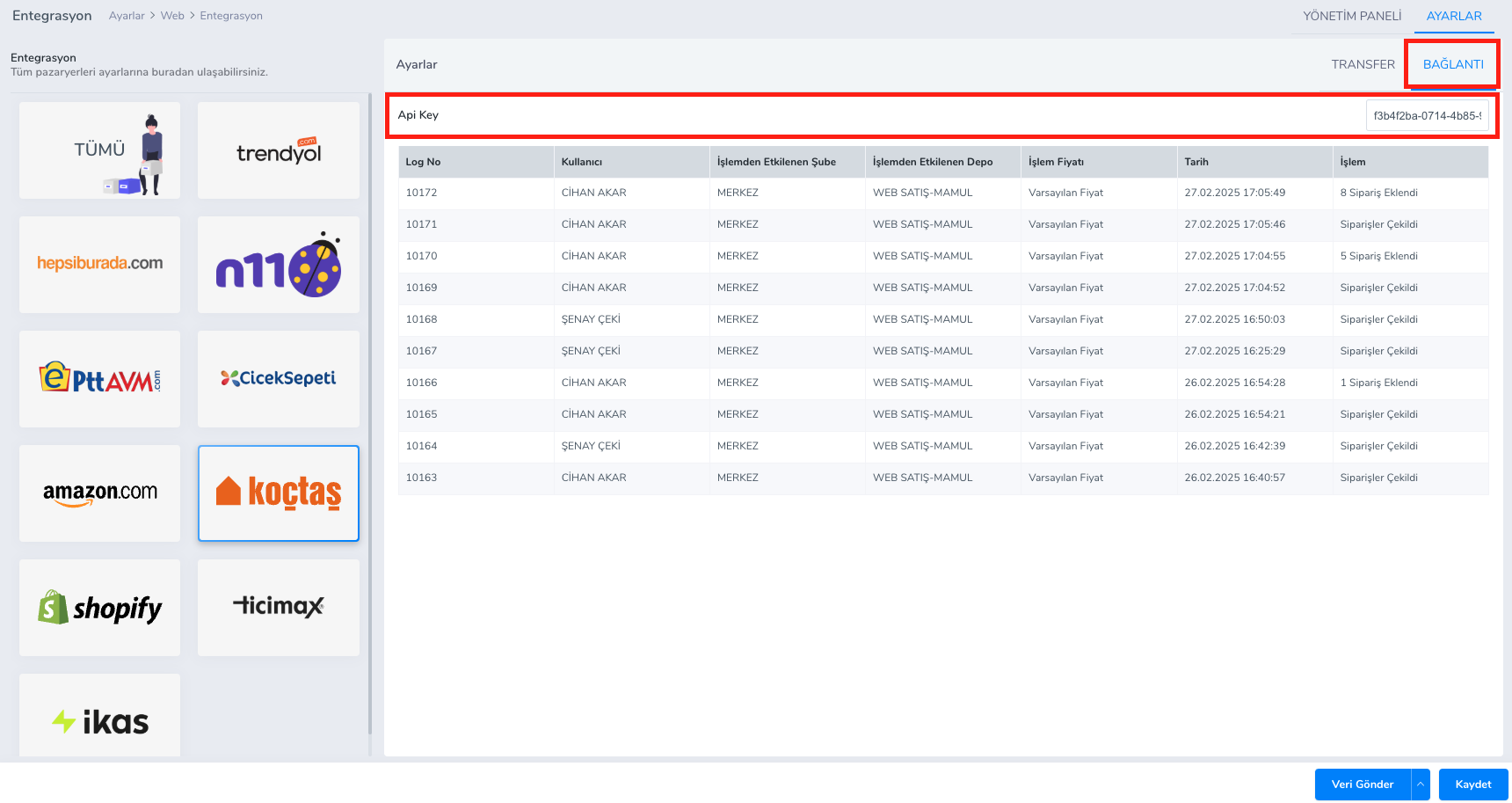 - .Üst kısımdaki tablardan Ayarlar -> Bağlantı tabına tıklayınız. Koçtaş’tan aldığınız Api Key alanını doldurup kaydediniz.