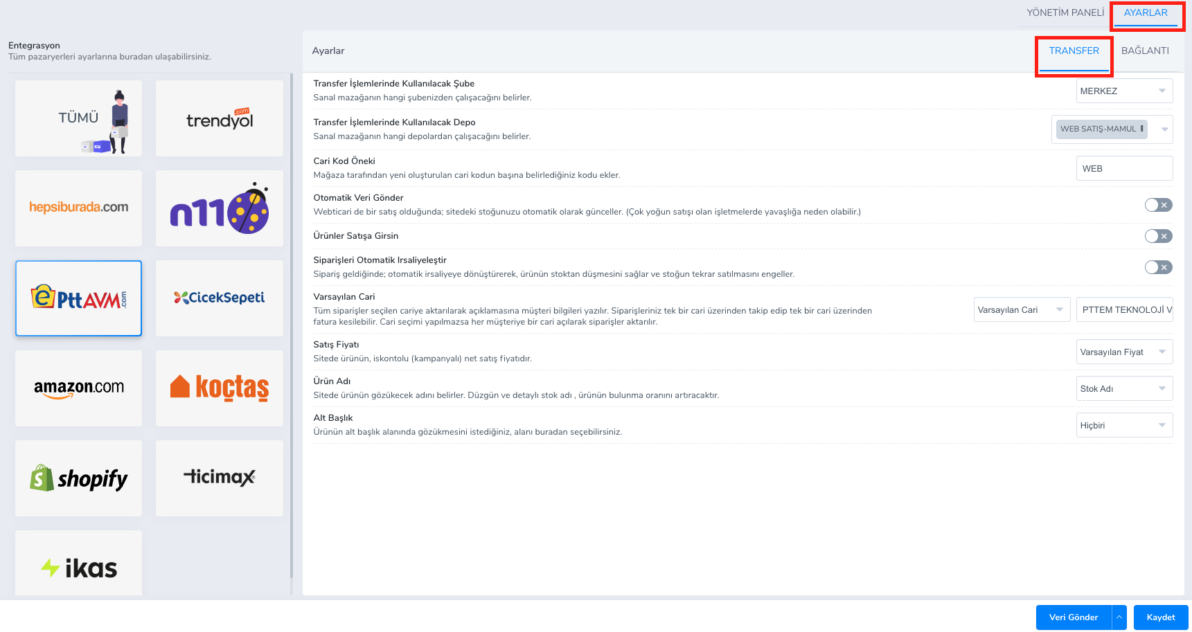 Entegrasyon ayarları tamamlandıktan sonra Transfer Ayarları altından özelleştirme işlemlerini yapabilirsiniz.