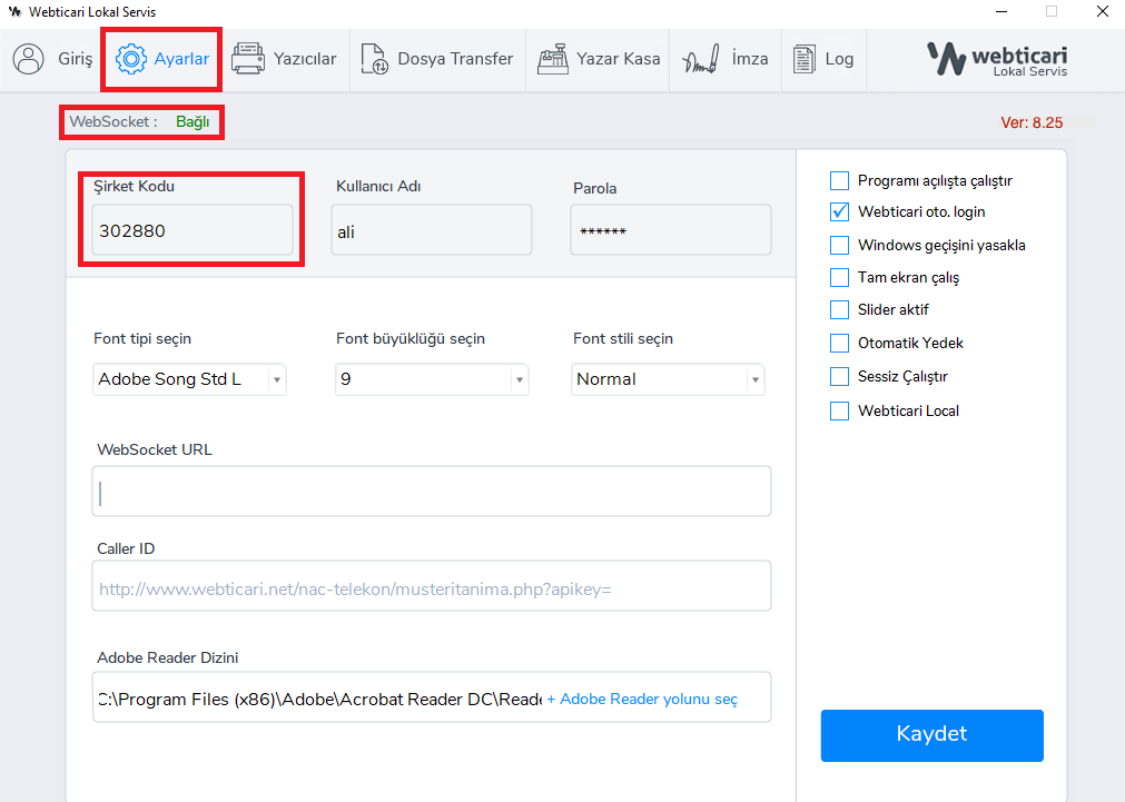 2- Webticari Lokal Servis programını çalıştırdığınızda gerekli ayarları aşağıdan kontrol ediniz.