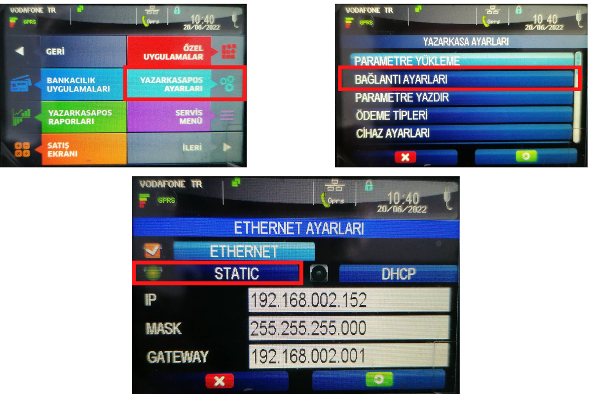 Yazarkasa IP tanımı için: Yazarkasa üzerinden F tuşuna basın, menüden “Yazarkasa Pos Ayarları” tıklanır ve şifre ekranında 0000 ile giriş yapılır. Bağlantı ayarları ekranında Ethernet tipi Statik olmalıdır, IP bilgileri doğru şekilde doldurulmalıdır.