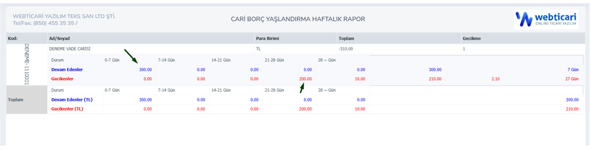 Rapor alındığında, kırmızı sonuçlar vadesi geçen ödemeleri, maviler ise vadesi gelmemiş  olan tutarları gösterir.