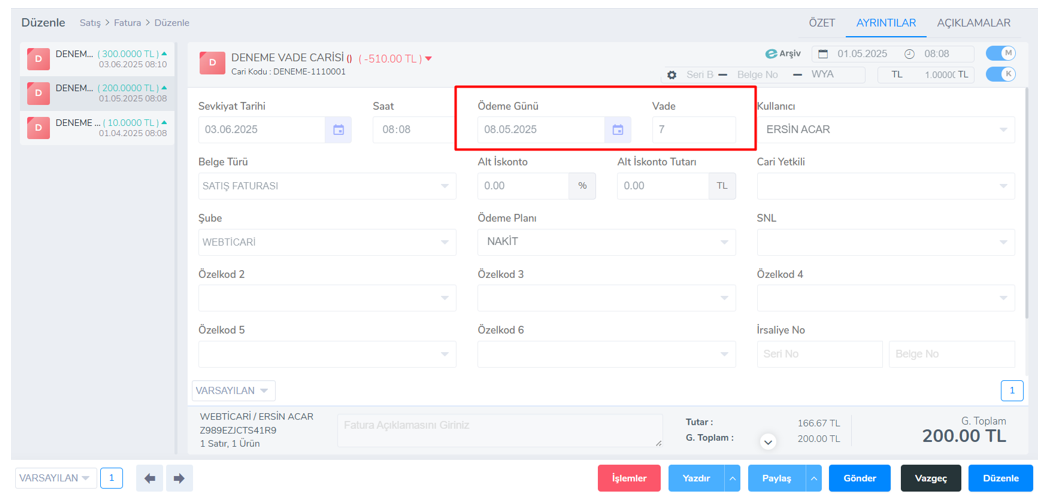 Faturanın ödeme tarihi, detay tabındaki Ödeme günü veya vade günü yazılarak belirlenir ve bu tarihte ödenmesi gerektiği anlamına gelir.