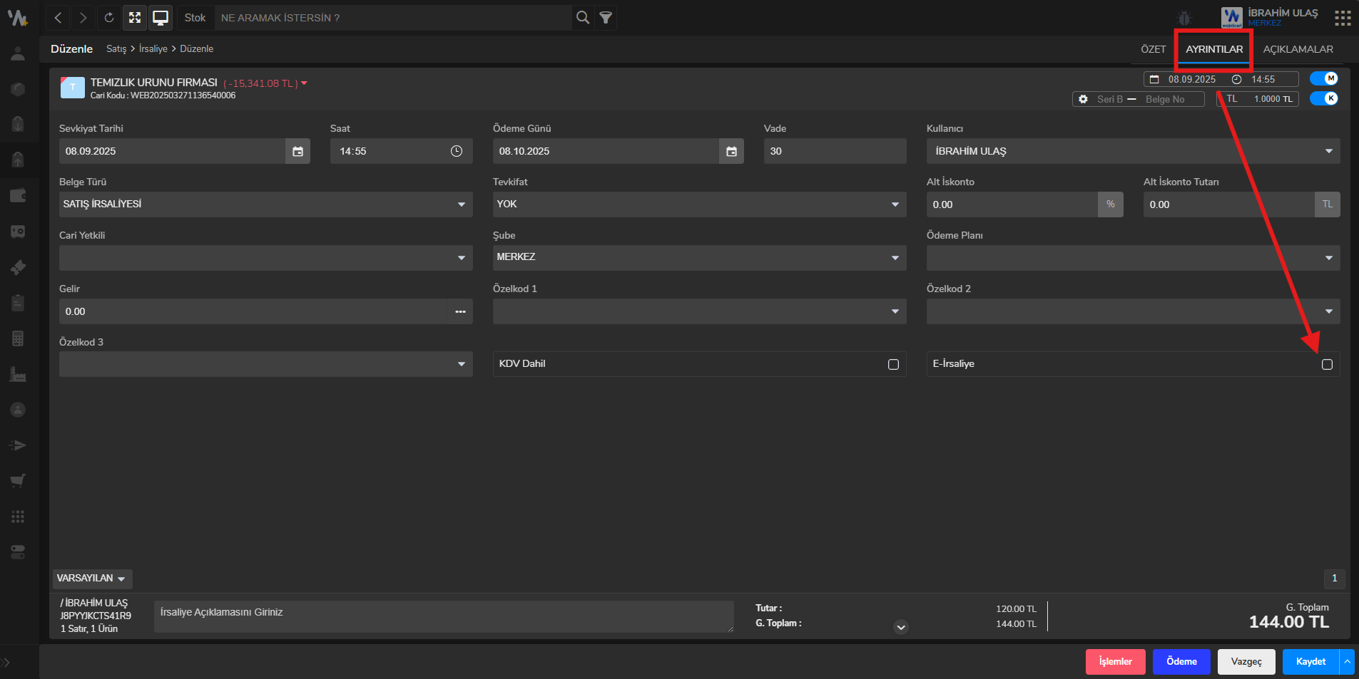 - Ayrıntılar sekmesine tıklayıp sekmede bulunan e-İrsaliye kutucuğunu işaretleyiniz.