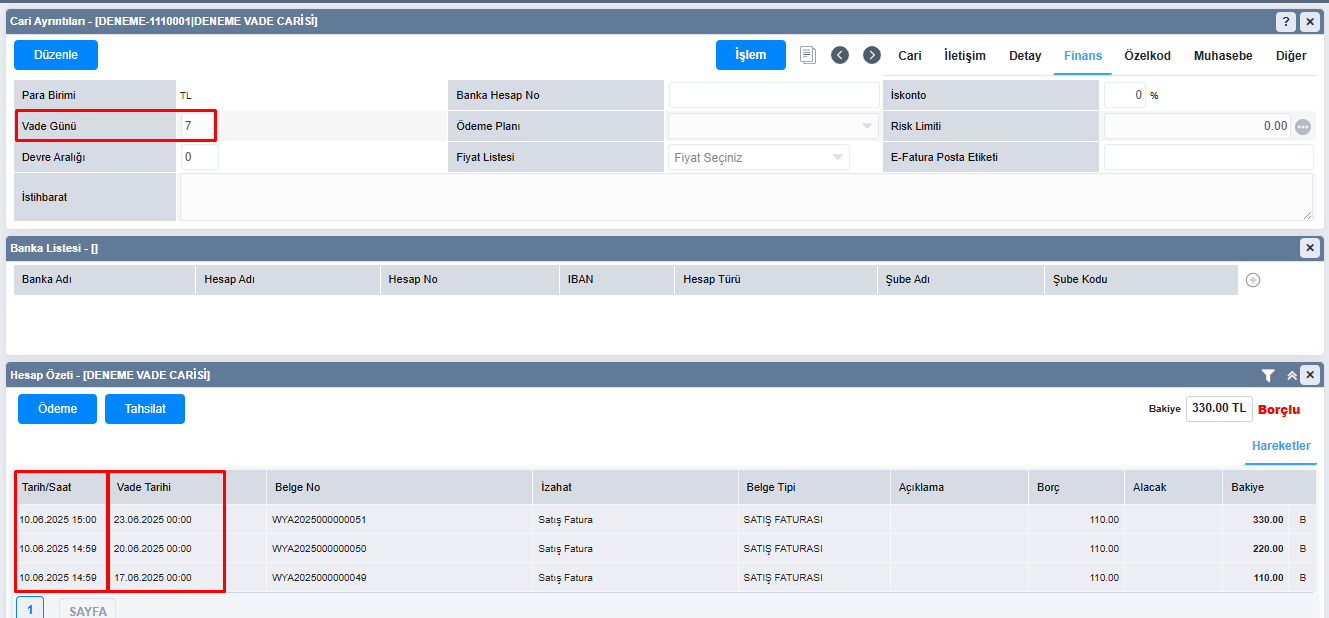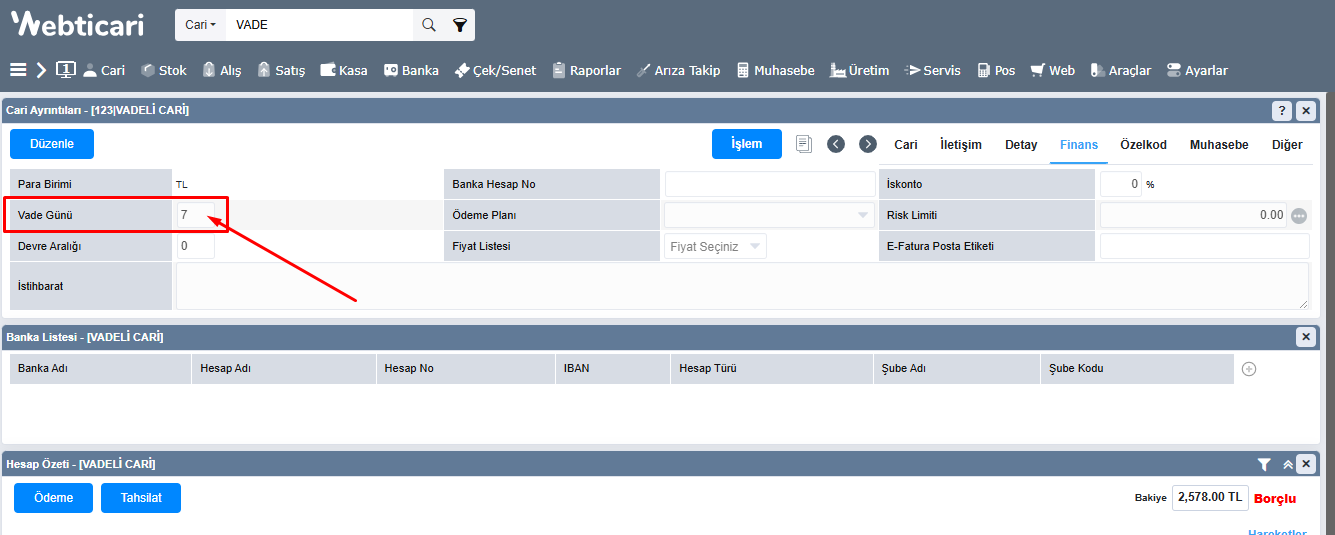 ***Eğer bir cariye sürekli aynı vade (ödeme tarihinde) çalışmak istiyorsak, cari kartında, finans tabında ki vade alanına vade gününü girmeniz her faturaya bu gün kadar vade atar.   Fakat bu vade fatura üzerinden değişirse fatura tarihini dikkate alır. Özetle cari karta girdiğiniz değer sadece varsayılan vade olup, sonradan faturanın içinden değiştirilebilir.