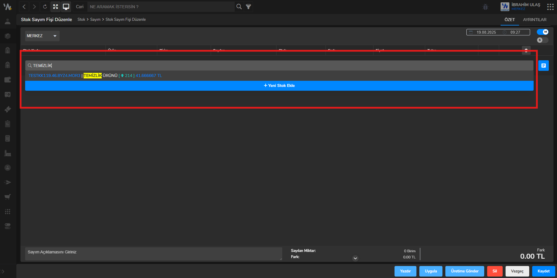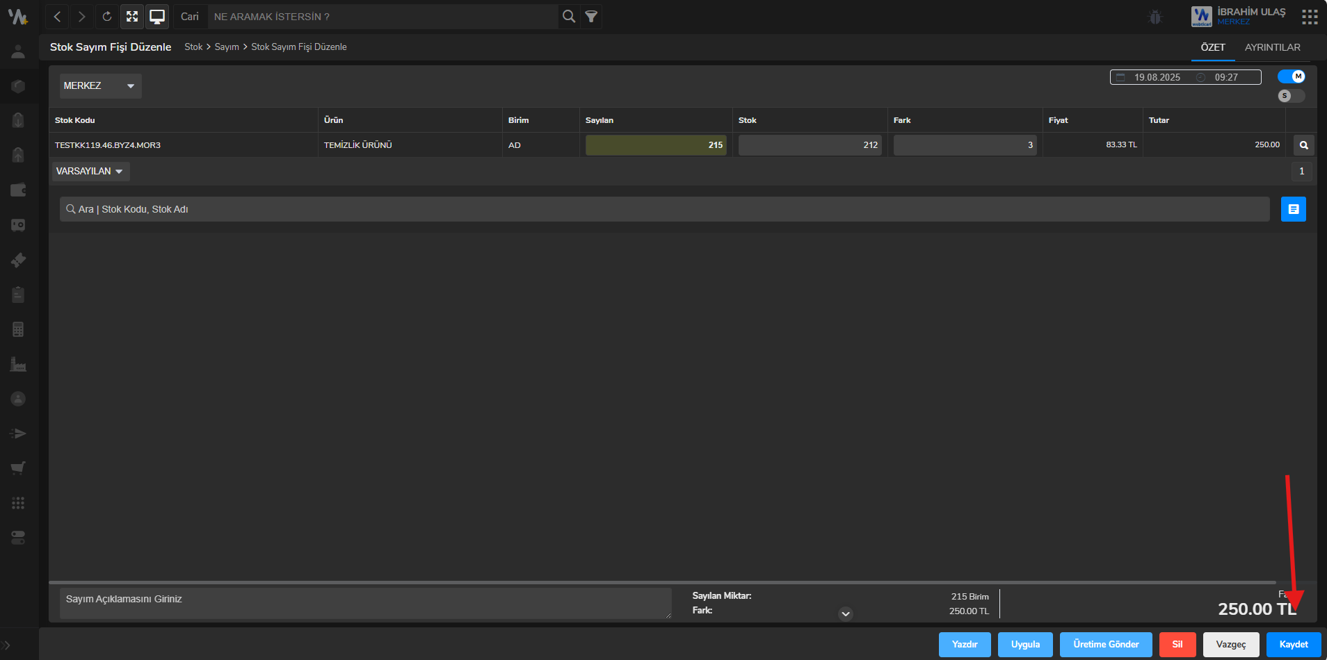 6. Stok giriş işlemleriniz bittikten sonra “Kaydet” butonuna tıklayarak sayım fişinizi kaydediniz.