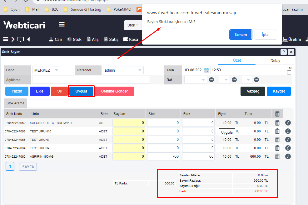 Webticari'de sayım yapmak için; Stok -> Sayım -> Yeni Sayım menüsü kullanılır. Sayım depo bazlı yapılmaktadır, öncelikle sayacağınız depoyu seçmeli ve ardından sağdaki listeden sayacağınız stokları listeye eklemelisiniz.