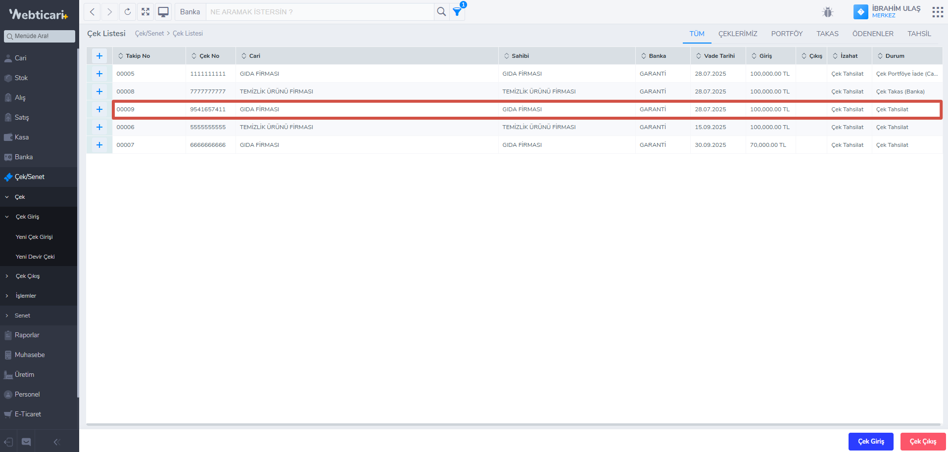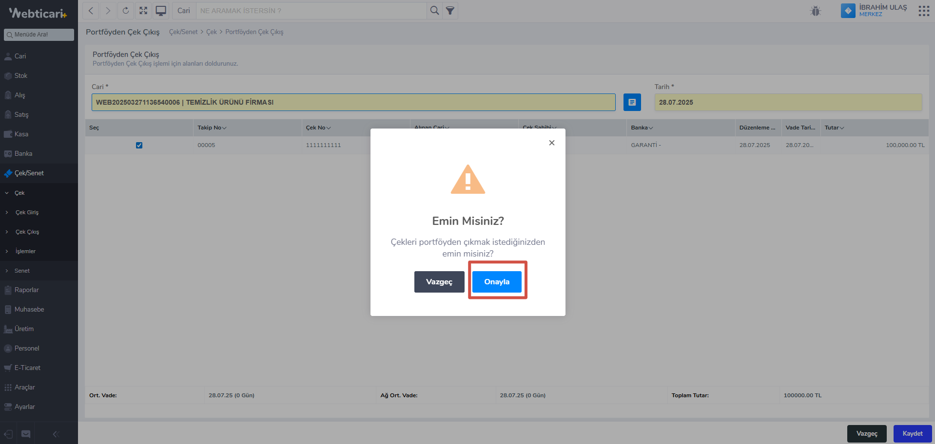 - Böylece çek portföyden çıkılmış olacaktır. Çek listesinden çekin durumunu kontrol edebilirsiniz.
