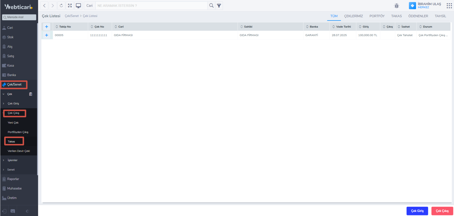 - Çek/Senet -> Çek çıkış -> Takas butonuna tıklayınız.