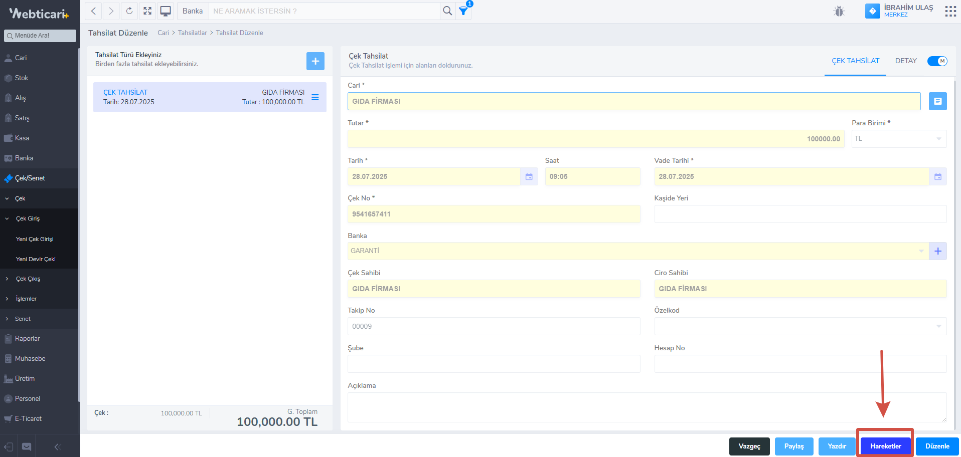 - Ekranınızın sağ altında bulunan Düzenle tuşuna basarak girdiğiniz bilgileri tekrardan düzenleyebilirsiniz. Eğer bilgileri değiştirmek istediğiniz çekin hareketi varsa Hareketler bölümünden çekin hareketlerini silmeniz gerekmektedir.