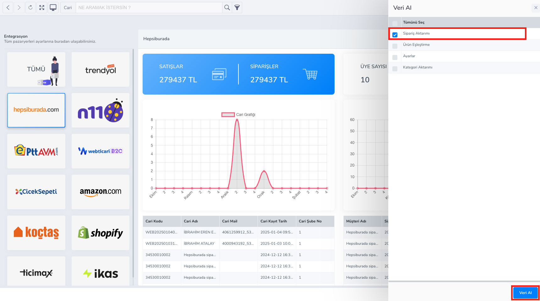 Hepsiburada siparişlerinizi çektiğinizde Satış -> Sipariş -> Satış Siparişleri kısmından görüntüleyebilirsiniz. Gelmeyen siparişleriniz var ise lütfen veri al işleminden sonra gösterilen uyarı mesajını dikkatlice okuyup hatanın nedenine göre işlem yapınız.