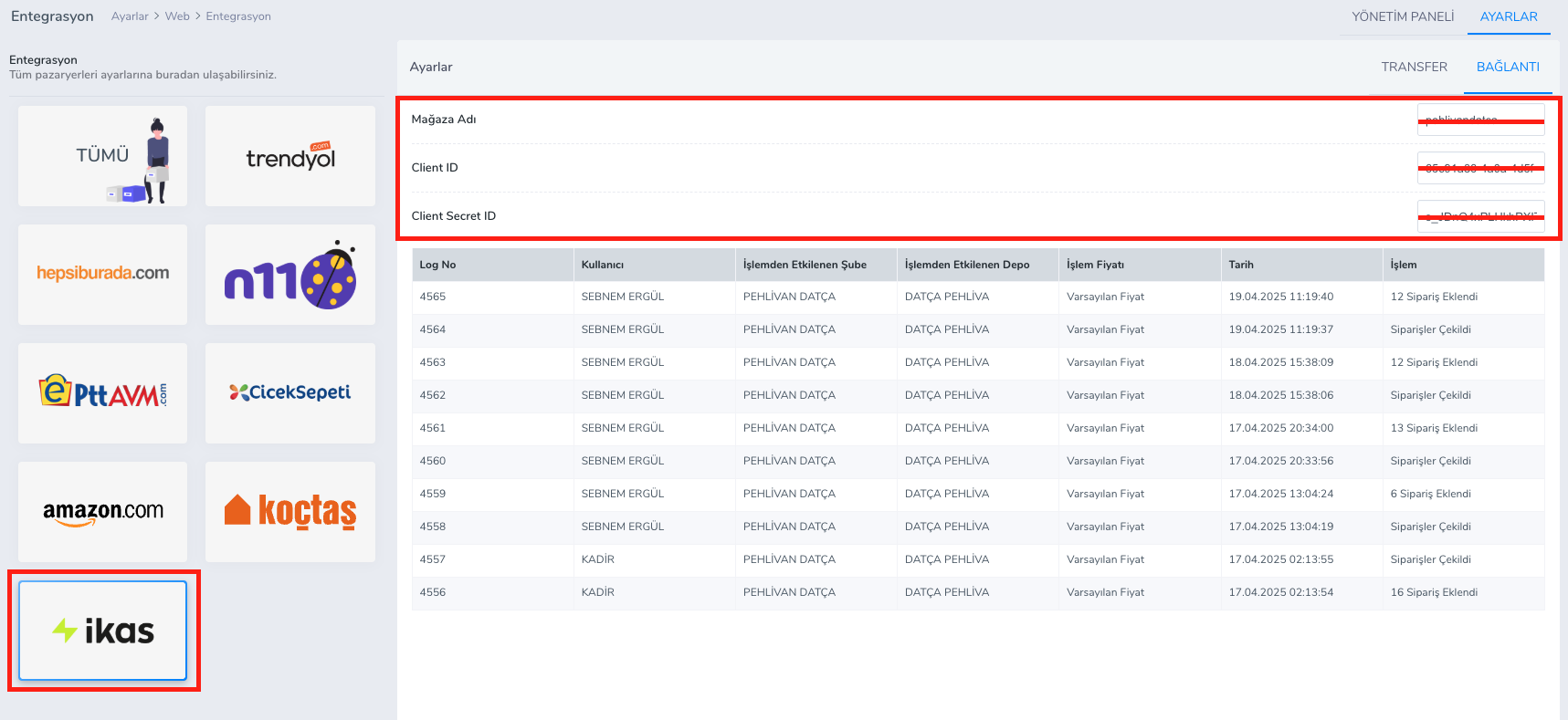 - Üst kısımdaki tablardan Ayarlar -> Bağlantı tabına tıklayınız. İkas panelinden aldığınız bilgileri ilgili alanlara doldurup kaydediniz.