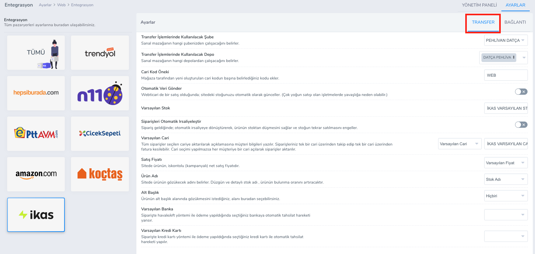 Bağlantı ayarlarını tamamladıktan sonra İkas -> Ayarlar > Transfer Ayarları tabı altından özelleştirme ayarlarınızı yapmalısınız.