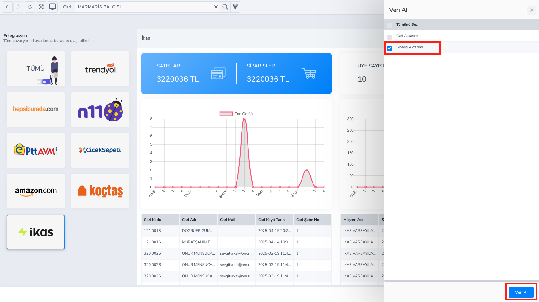 İkas’a gelen siparişlerinizi aktarmanız için ;