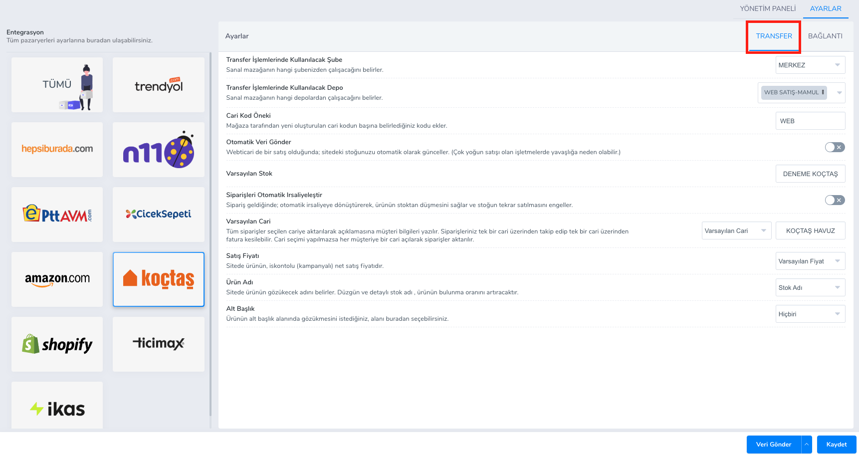 Bağlantı ayarlarını tamamladıktan sonra Koçtaş -> Ayarlar > Transfer Ayarları tabı altından özelleştirme ayarlarınızı yapmalısınız.