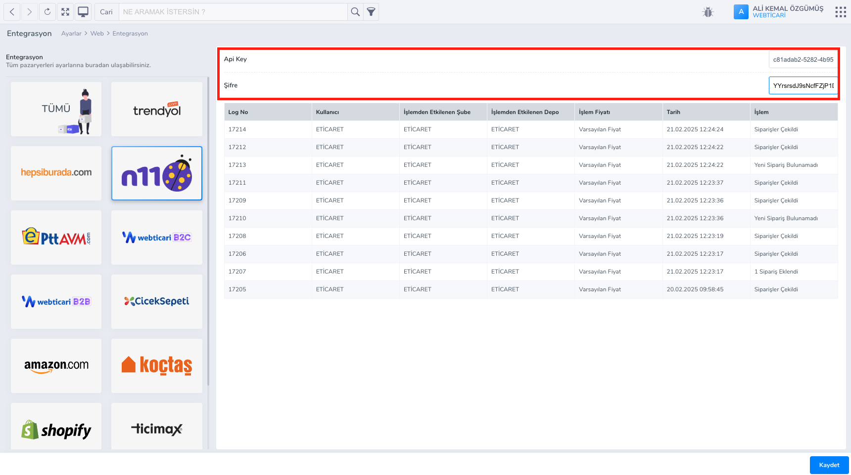 - Menüden Web -> N11 butonuna tıklayınız.Açılan sayfadan Apikey ve Şifre alanlarını doldurunuz.Üst kısımda anlatıldığı gibi N11 satıcı panelinden Api Anahtarını kopyalayın ve Webticari’de Apikey alanına yapıştırınız.