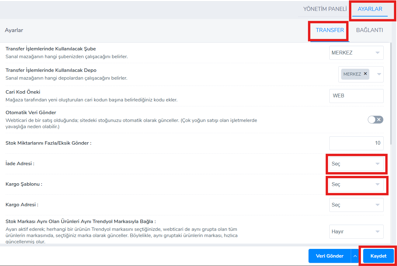 - Bağlantı ayarlarını tamamladıktan sonra N11 -> Ayarlar > Transfer Ayarları tabı altından özelleştirme ayarlarınızı yapmalısınız.