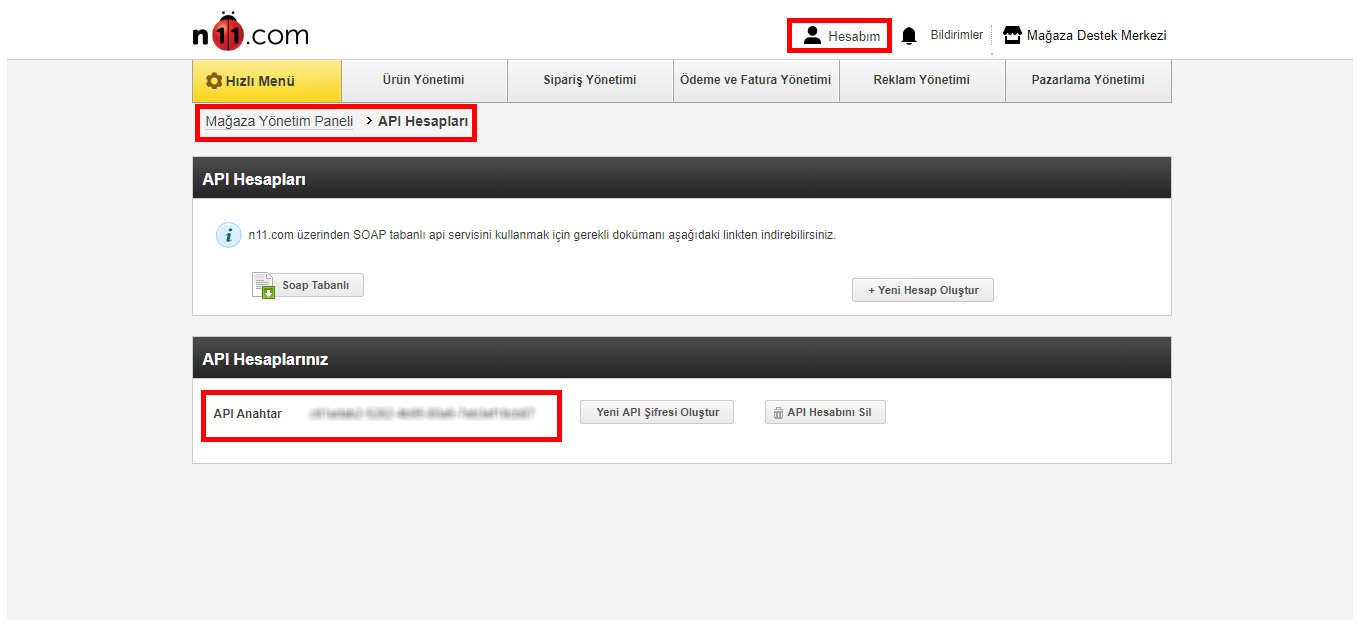 Öncelikle N11 satıcı paneline https://so.n11.com/ giriş yapınız. Açılan sayfada Hesabım > API Hesapları sekmesi tıklanır. Açılan sayfada “Yeni API şifresi oluştur” tıklanır.