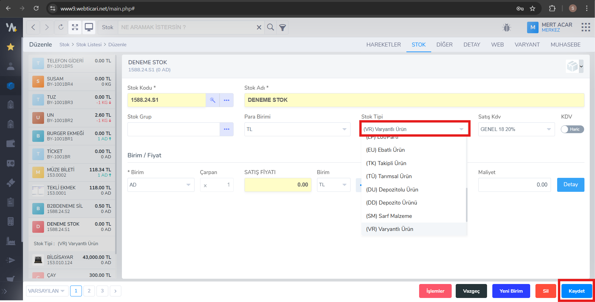 - Stok seçildikten sonra Stok Tipi alanından Varyantlı Ürün (VR) alanını seçip kaydet demelisiniz.Daha sonra üstteki tablardan Varyant -> Varyant ekle butonuna tıklayarak “kod” ve “varyant adı” yazarak varyantlarınızı tanımlayınız.