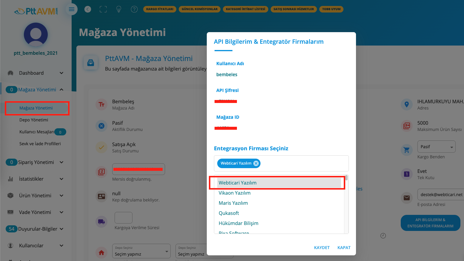 Açılan pencerede Kullanıcı Adı, API Şifresi, Mağaza ID ve Entegratör Firmaları görünecektir. “Webticari Yazılım” firmasını seçip kaydediniz.