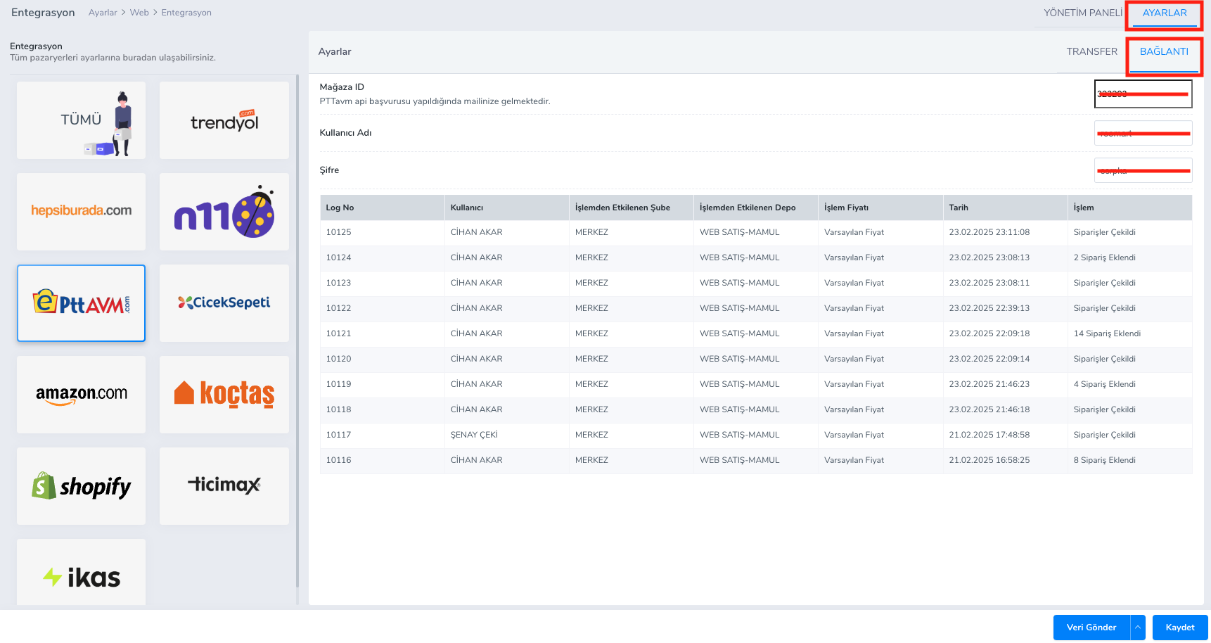 Entegrasyon ayarları için Bağlantı Ayarları altından Kullanıcı adı, Şifre ve Mağaza ID bilgilerini giriniz.