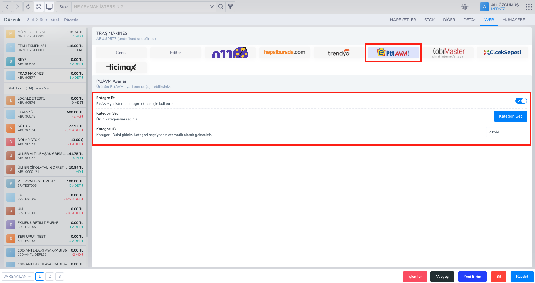 2.  Üst kısımdaki tablardan Web -> pttAvm tabına tıklayınız. Buradan kategori seç‘e tıklayarak ürünün kategorisini belirleyip kaydet butonuna tıklayınız. Eğer göndereceğiniz ürün pttAvm’de halihazırda açılmış ve satışta ise mutlaka barcode değerleri girilmelidir.