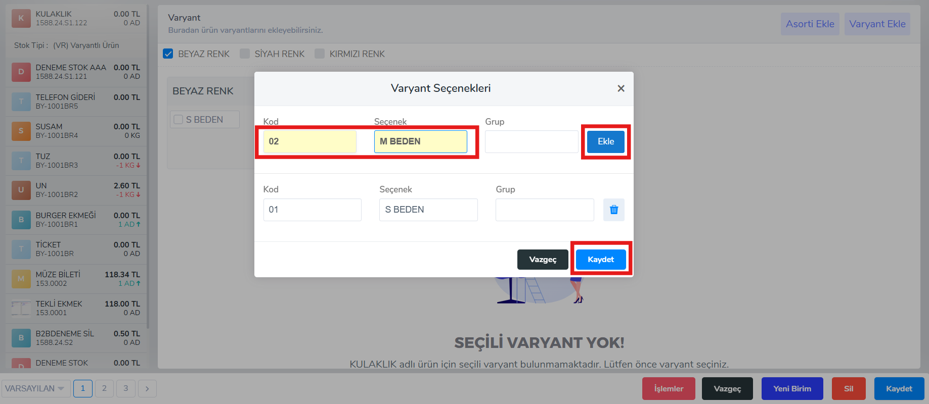 Varyantlarınızı ekleyip kaydettikten sonra varyant seçenekleriniz otomatik gelecektir.Varolan varyantların altına ek varyant tanımlamak için (beden,ölçü vb.) kayıtlı varyantın önündeki kutucuğa tıklayıp ” + “ butonu ile ek varyantlarınızı tanımlayınız.“Ekle” ve “kaydet” butonuna tıklayarak işlemlerinizi kaydediniz.