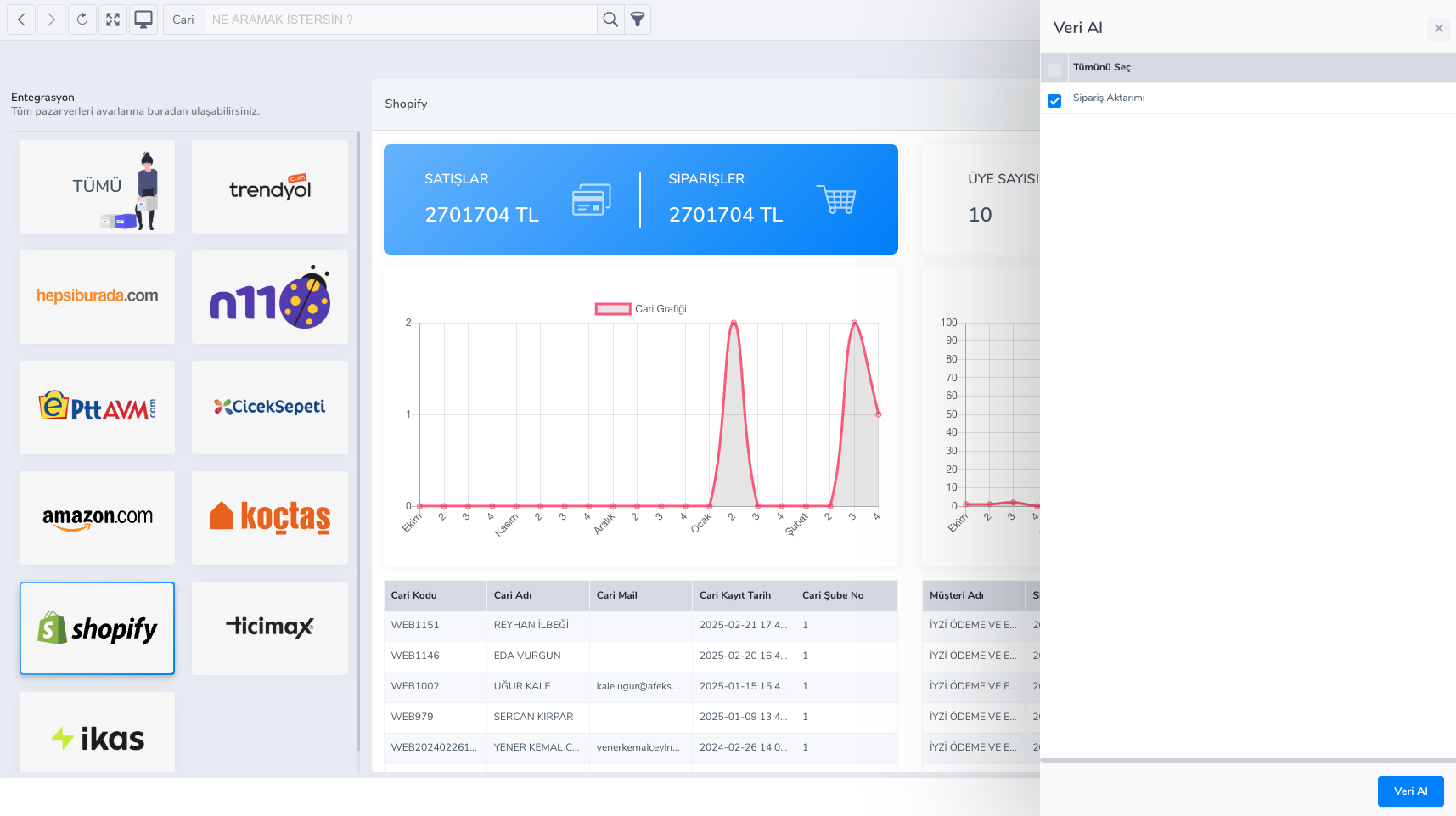 Web -> Shopify -> Veri al butonuna tıklayınız. Sipariş aktarımı seçeneğini işaretleyip veri al butonuna tıklayınız. Böylece Shopify’da varolan tüm siparişleriniz Webticari’ye aktarılacaktır.