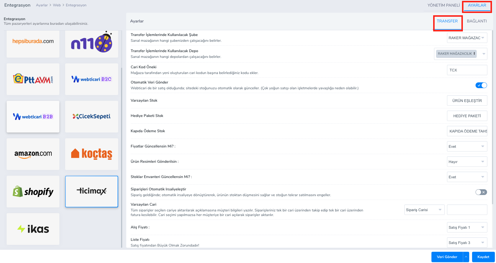 Bağlantı ayarlarını tamamladıktan sonra Ticimax -> Ayarlar > Transfer Ayarları tabı altından özelleştirme ayarlarınızı yapmalısınız.