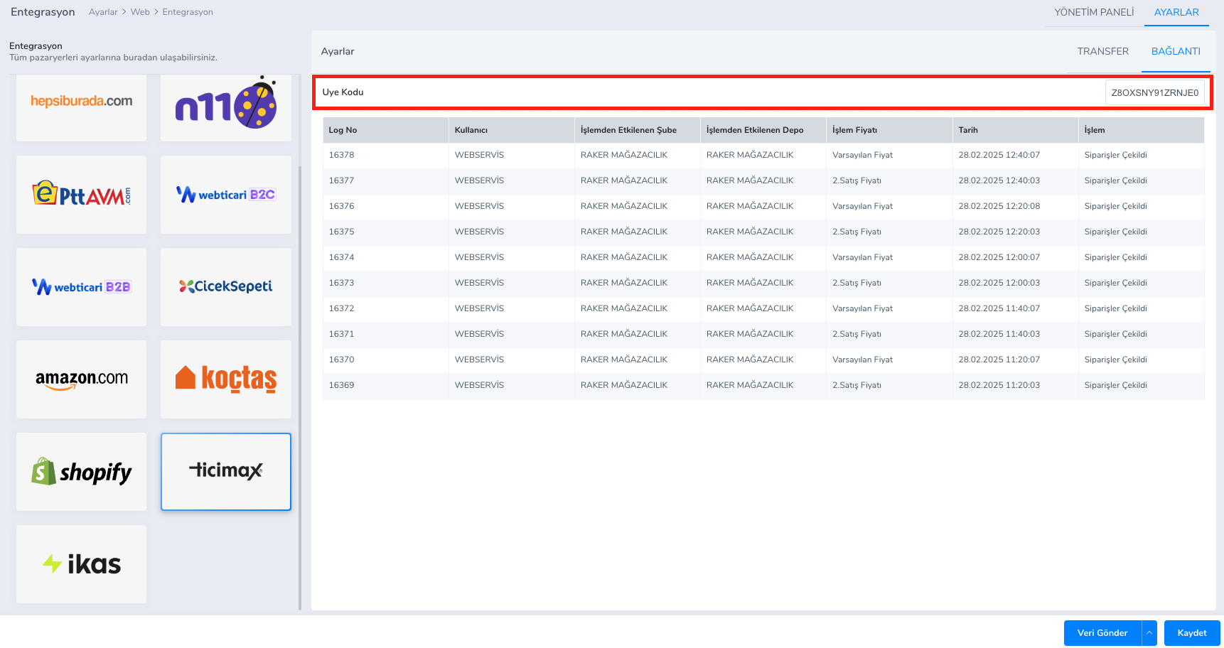 - .Üst kısımdaki tablardan Ayarlar -> Bağlantı tabına tıklayınız. Ticimax panelinden aldığınız Uye Kodu alanını doldurup kaydediniz.