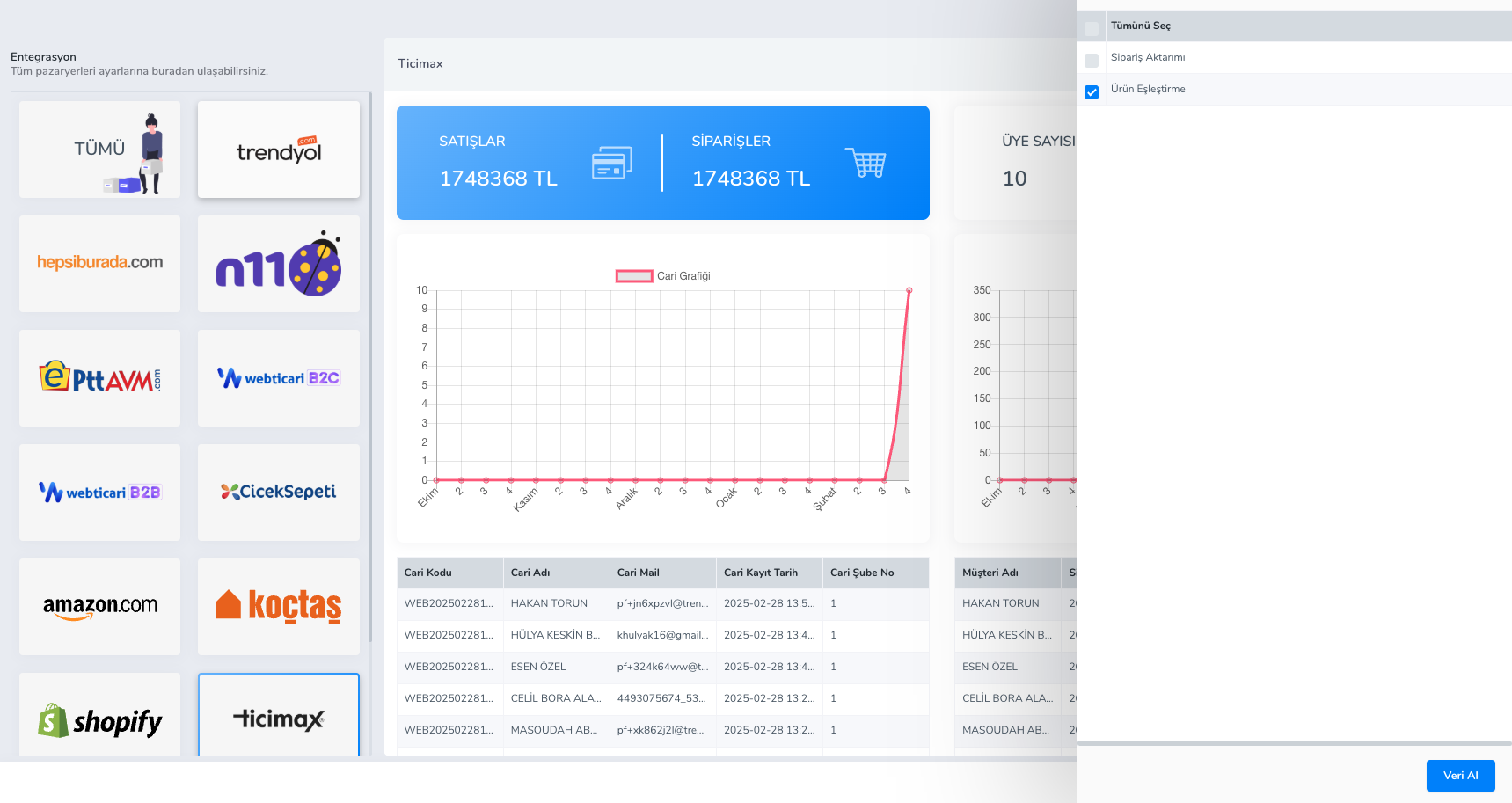 Tanımlamarı yaptıktan sonra Web -> Ticimax -> Transfer tabı altından Veri Al -> Eşleştir seçeneği seçilerek eşleştirme yapabilirsiniz.