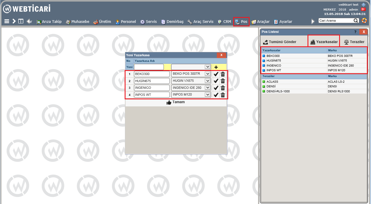1- Menüde bulunan Pos>Pos Terazi altından, “Yazarkasalar” butonu ile yeni bir Pos tanımı yapmalısınız. Açılan ekrandan yazarkasanızın ismini Ingenico yazınız ve yanındaki alandan Ingenico ‘IDE veya IWE’ yazarkasa modelini seçiniz “+” butonu ile yazarkasayı listeye ekleyiniz.