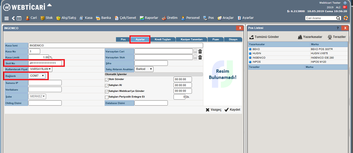 2- Pos tanımlandıktan sonra, yazarkasanın üzerine tıklayınız, “Ayarlar” tabı altından yazarkasaya ait SİCİL NO (yazarkasanın altında yazmaktadır) yazınız.