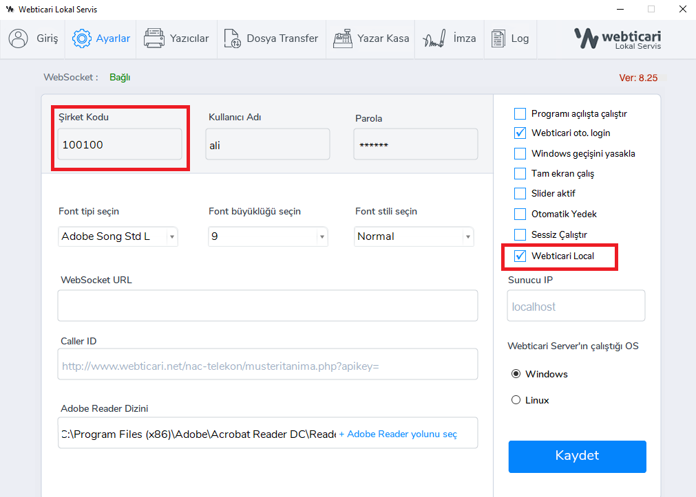 2- Webticari Lokal Servis programını çalıştırdığınızda gerekli ayarları aşağıdan kontrol ediniz.