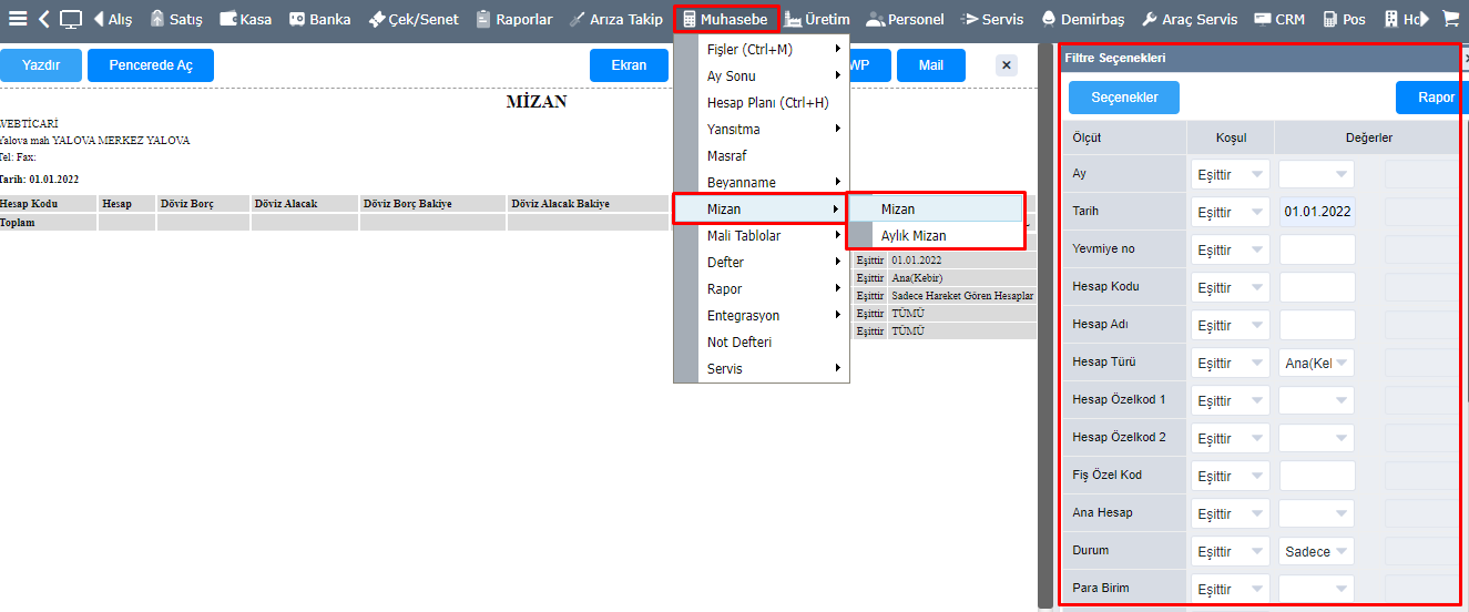 Filtre Seçeneklerinden istenilen Tarih, Hesap Türü, Para Birimi, Fiş No yada Hesap Kodu gibi özellikler belirterek mizan dökümünüzü alabilirsiniz.