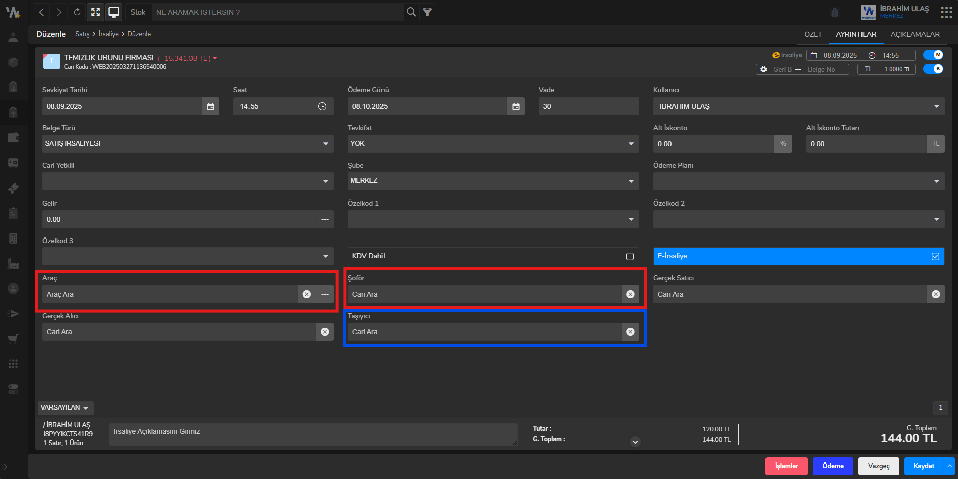 Not: “Şoför” alanını doldurmak için şoförün adına bir cari oluşturulmalı ve carinin “T.C. Kimlik Numarası” girilmelidir.