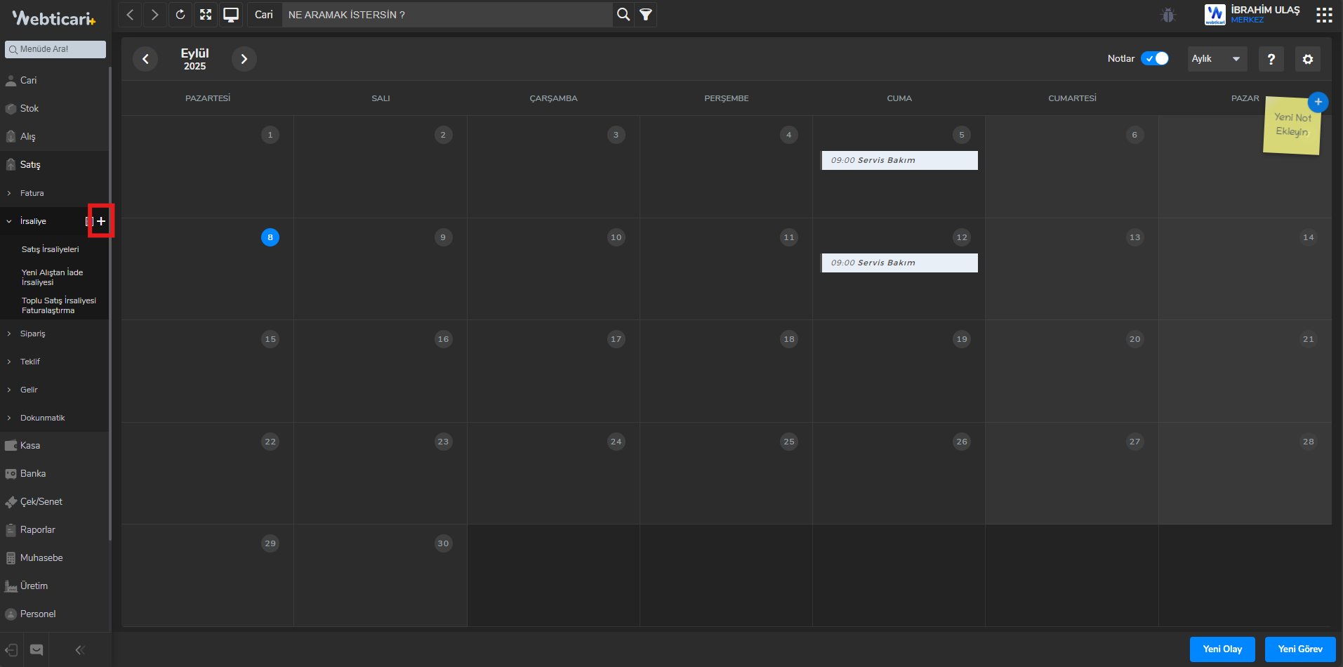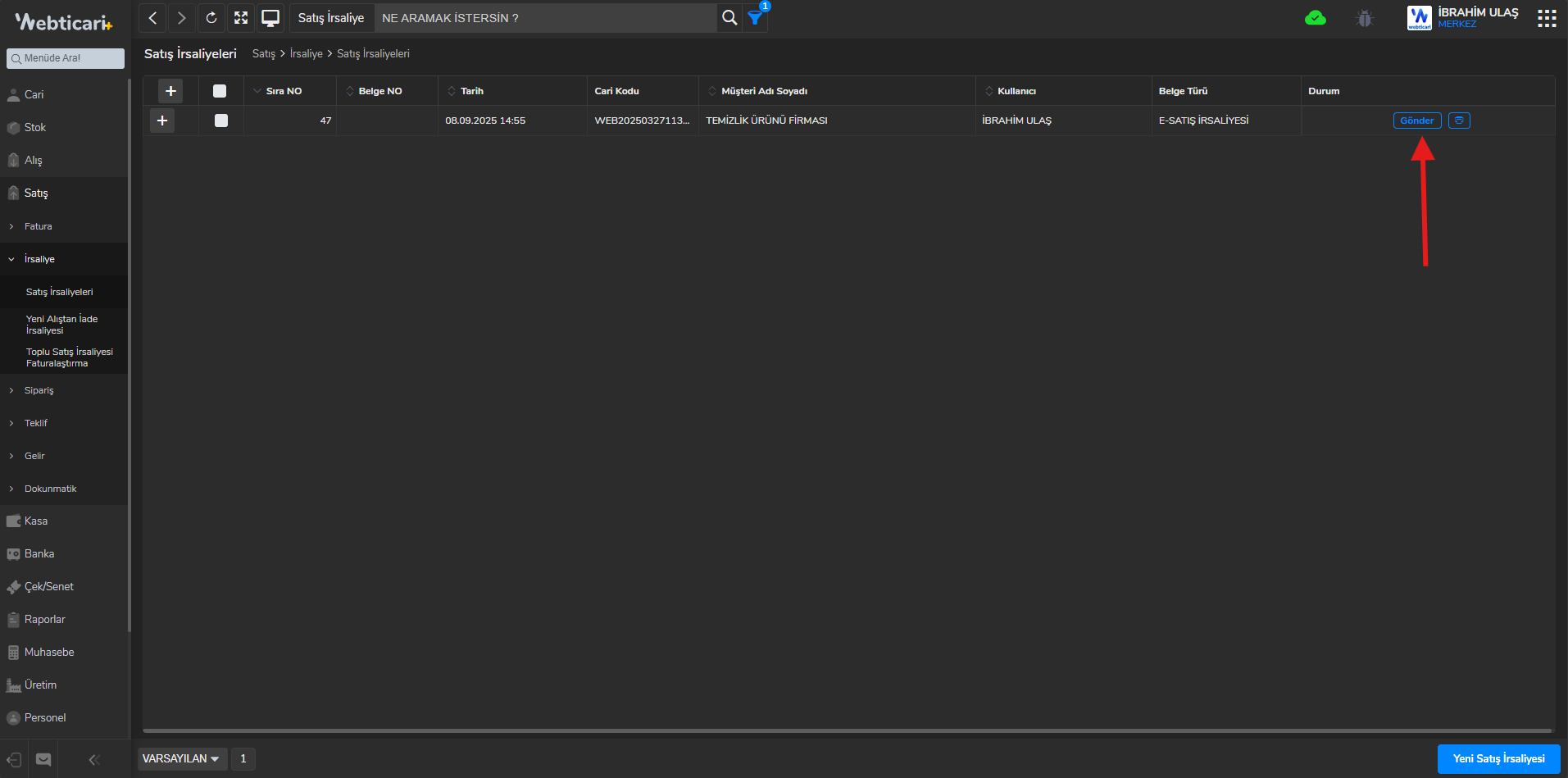 - Webticari ana menüsünden Satış -> İrsaliye -> İrsaliye Ekle (+) butonuna tıklayınız.