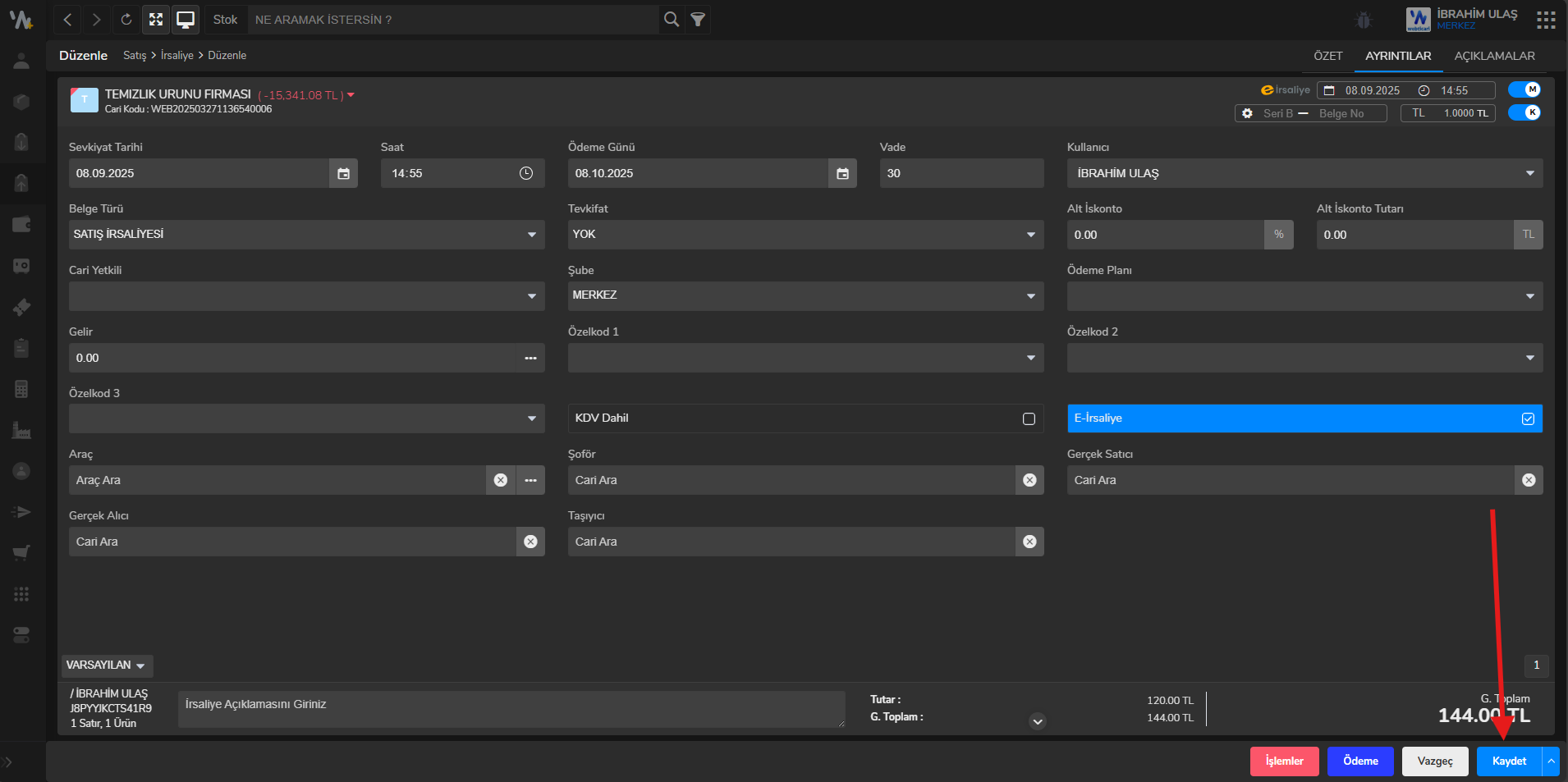 - Ayrıntılar sekmesine tıklayıp sekmede bulunan e-İrsaliye kutucuğunu işaretleyiniz.