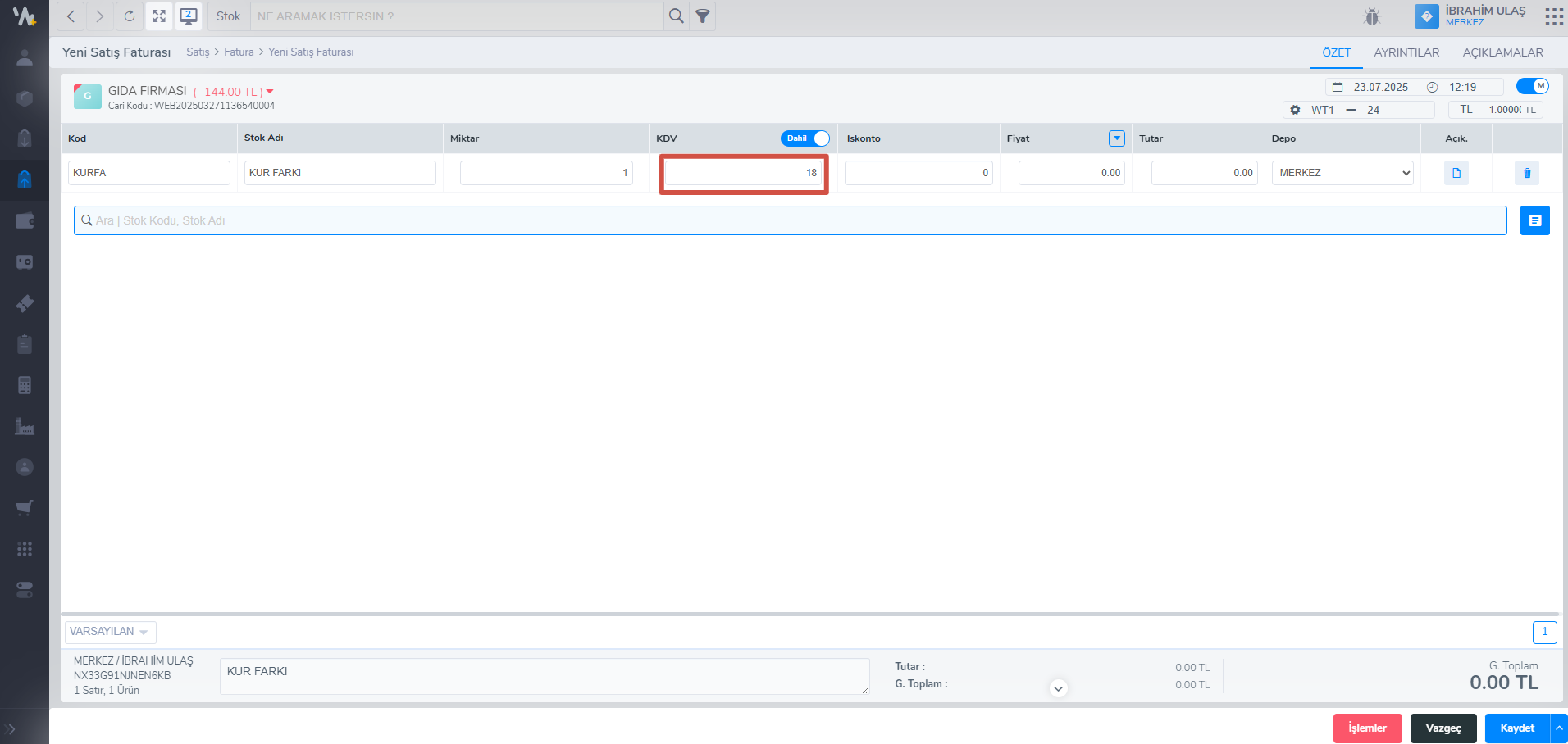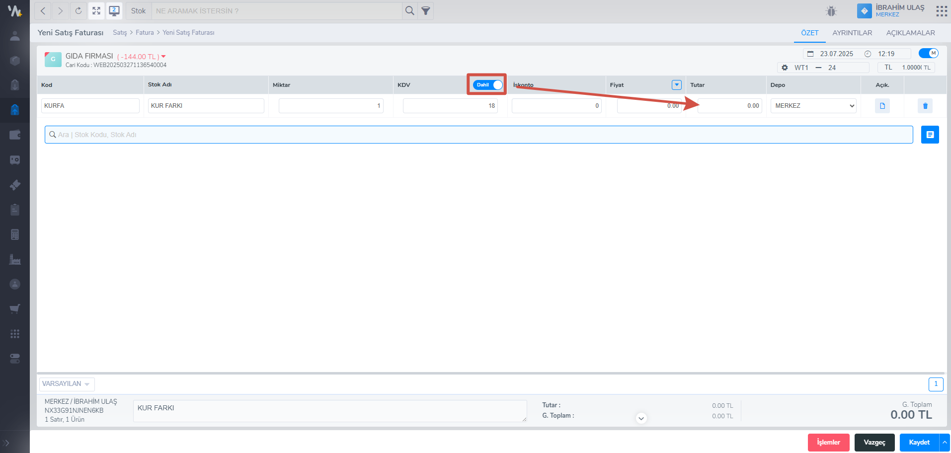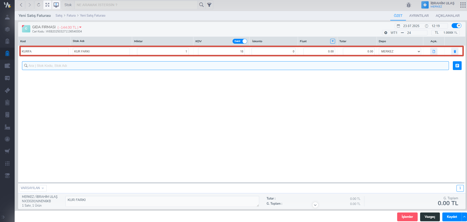 - Faturayı düzenleyeceğiniz cariyi seçtikten sonra Kur Farkı satırı otomatik olarak gelecektir.