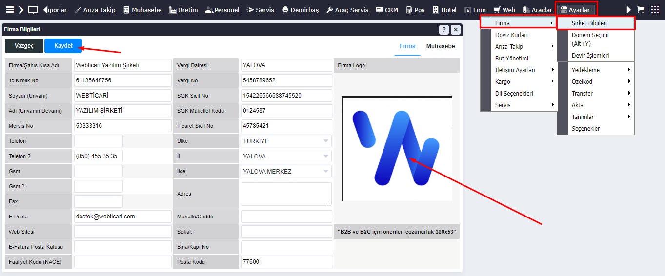 Ayarlar-Genel Ayarlar-Firma-Şirket Bilgileri ,adımlarını izleyerek ,logo alanının üzerine tıklayarak açılan dosya ,seç yükle adımlarını takip ederek logonuzu şirket bilgilerine ekleyebilirsiniz,