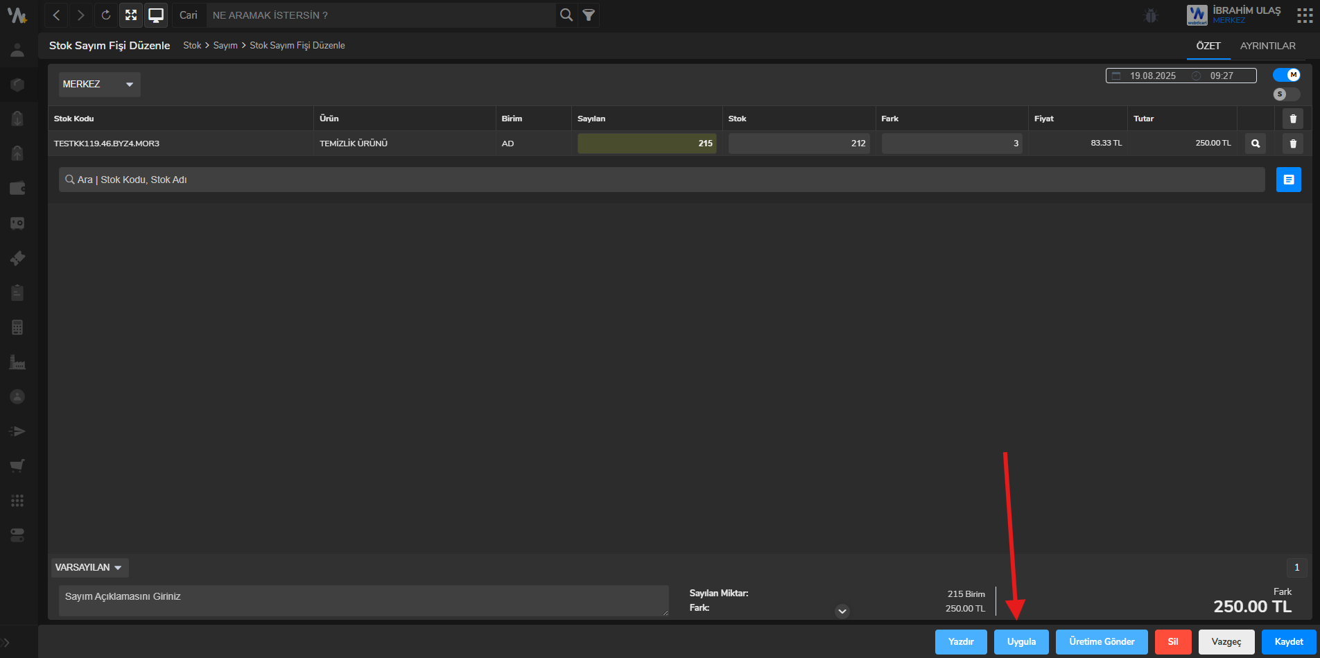 - “Düzenle” butonuna tıkladıktan sonra sayım fişinizi kontrol ediniz. Doğruluğundan eminseniz “Uygula” butonuna basarak sayımınızı stoklarınıza işleyebilirsiniz.