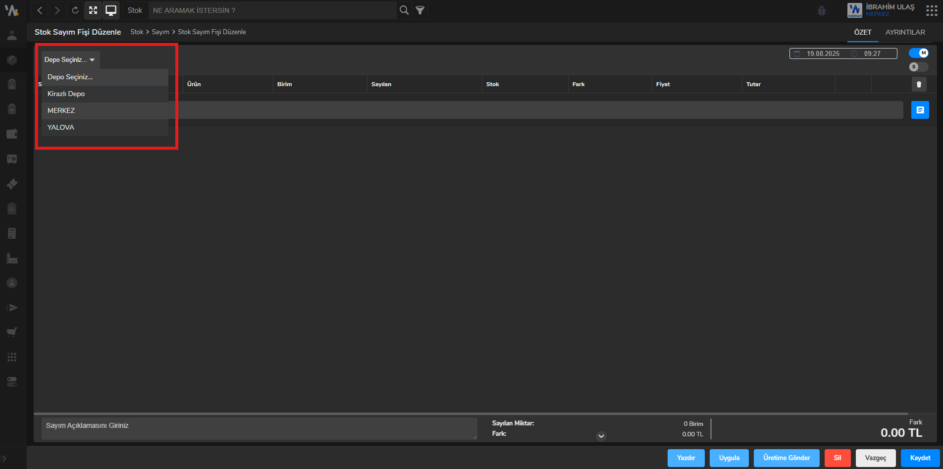 - Açılan sayfada sol üstte bulunan “Depo Seçiniz…” menüsünden sayımın yapılacağı depoyu seçiniz.