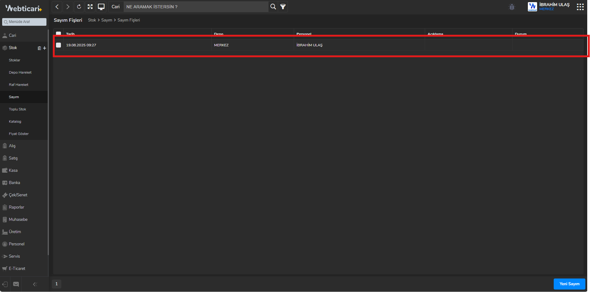 - “Yeni Sayım” butonuna tıklayarak yeni sayım fişi açınız.