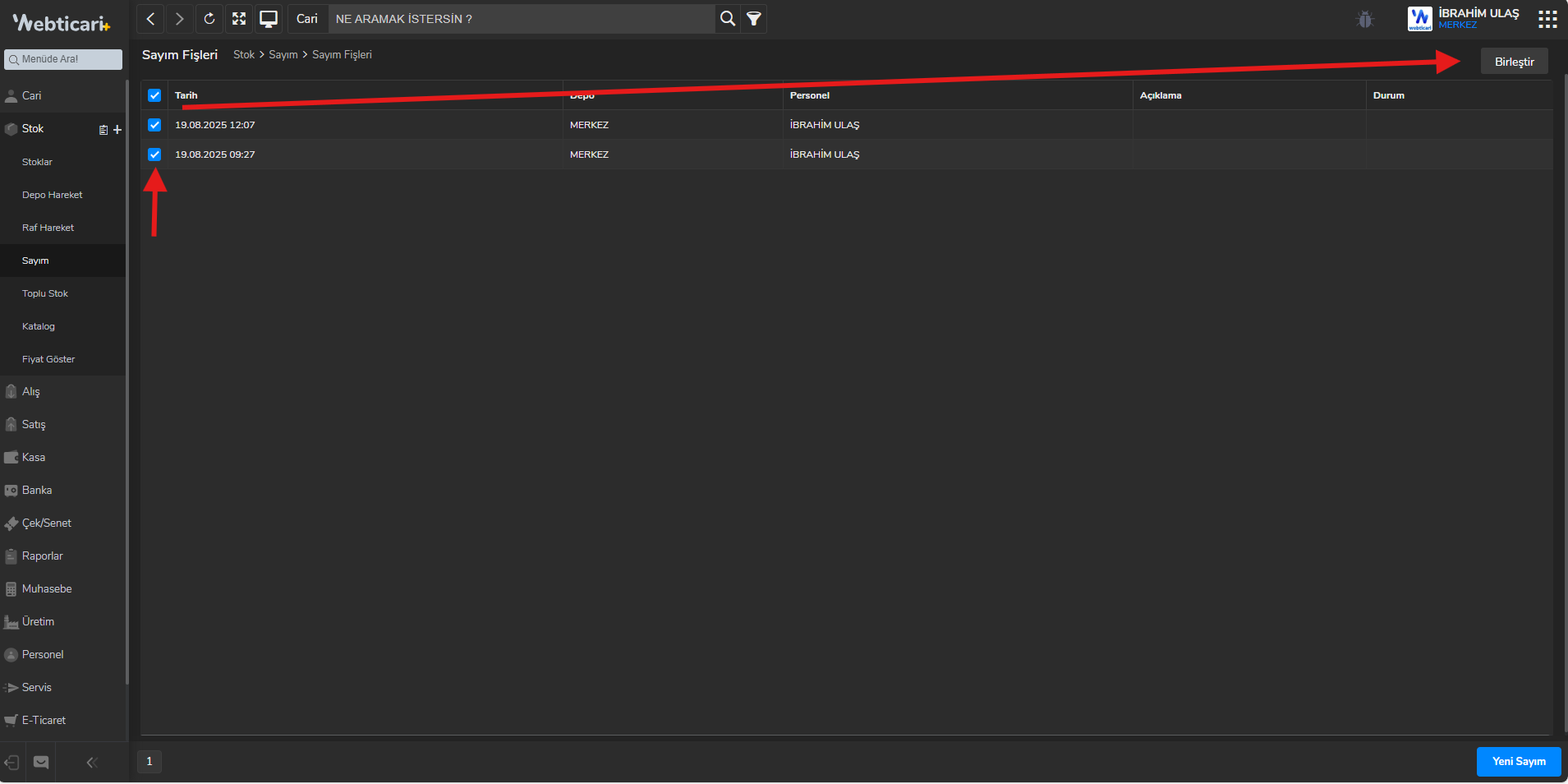 - Oluşturduğunuz fişlerin satırının solunda bulunan kutucukları işaretledikten sonra ekranın sağ üstünde bulunan “Birleştir” butonuna tıklayarak sayım fişlerinizi birleştirebilirsiniz.
